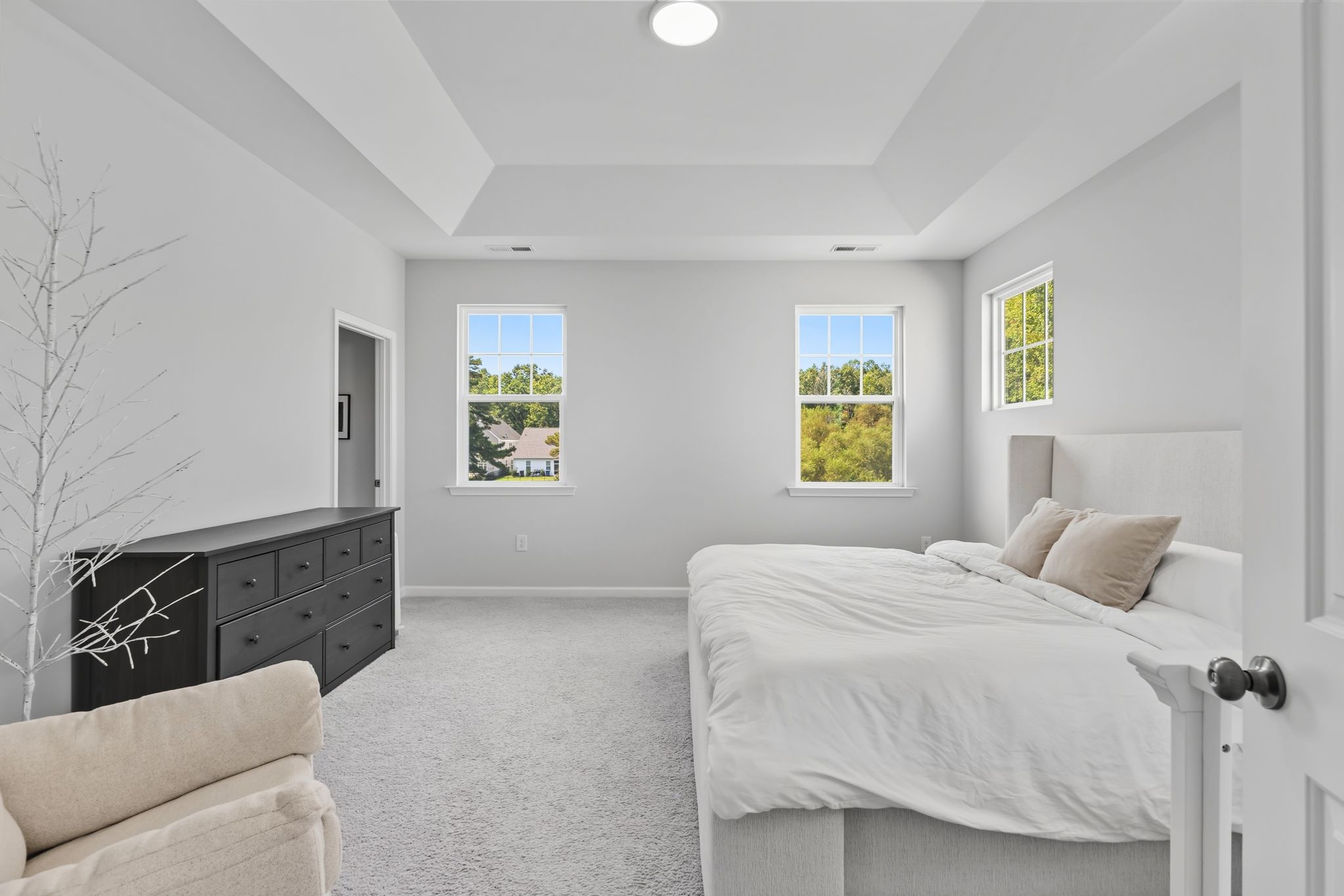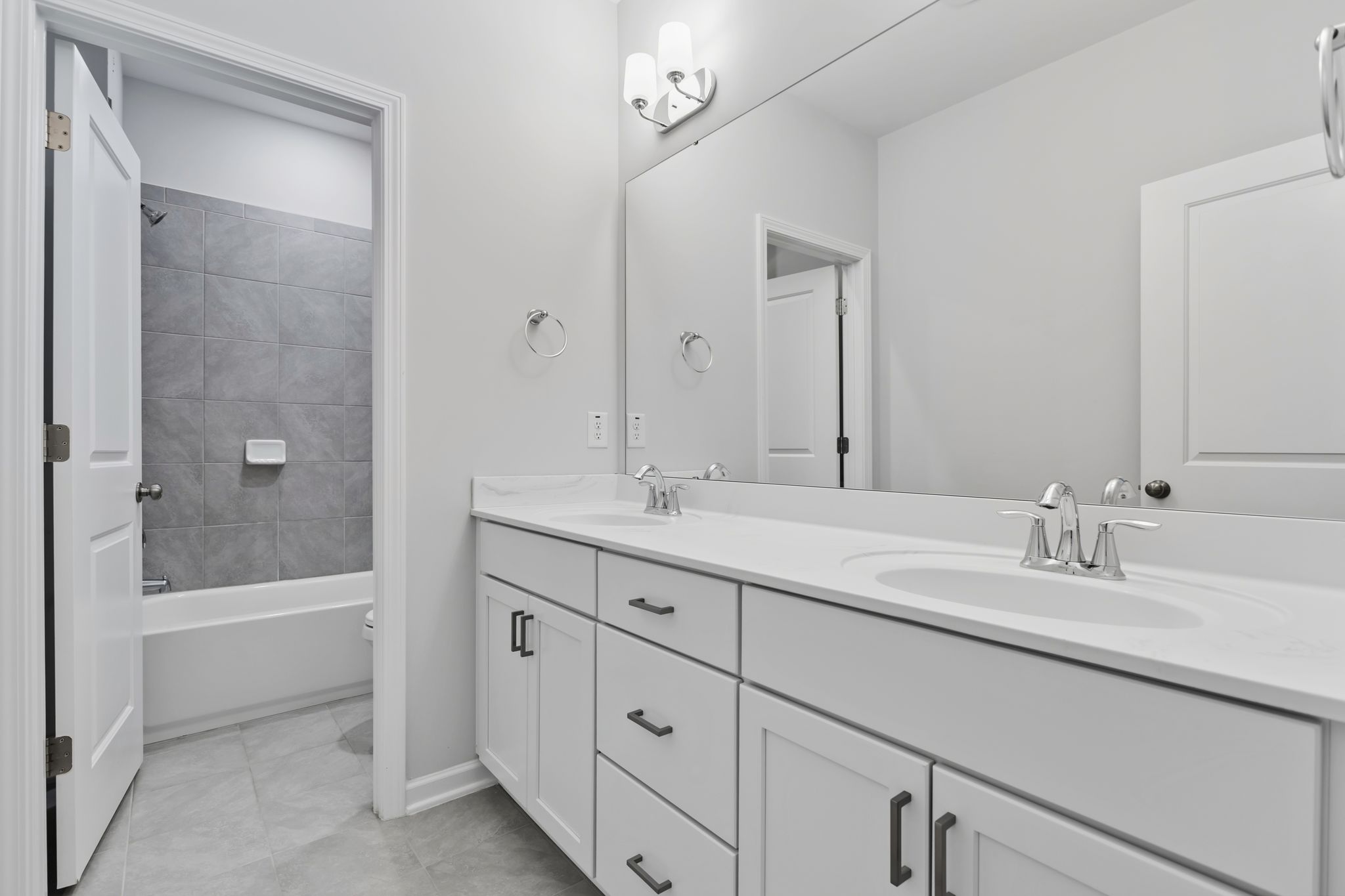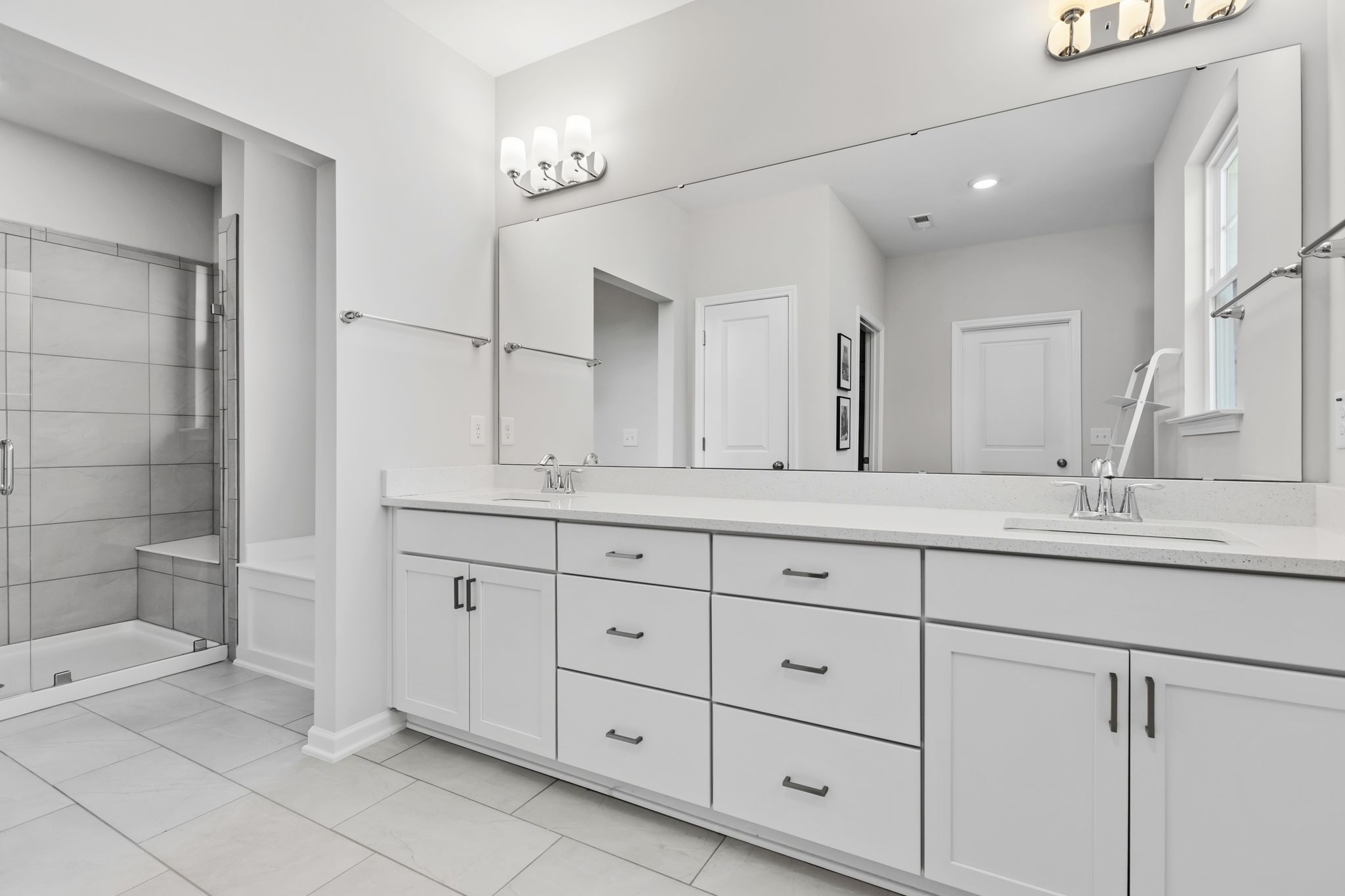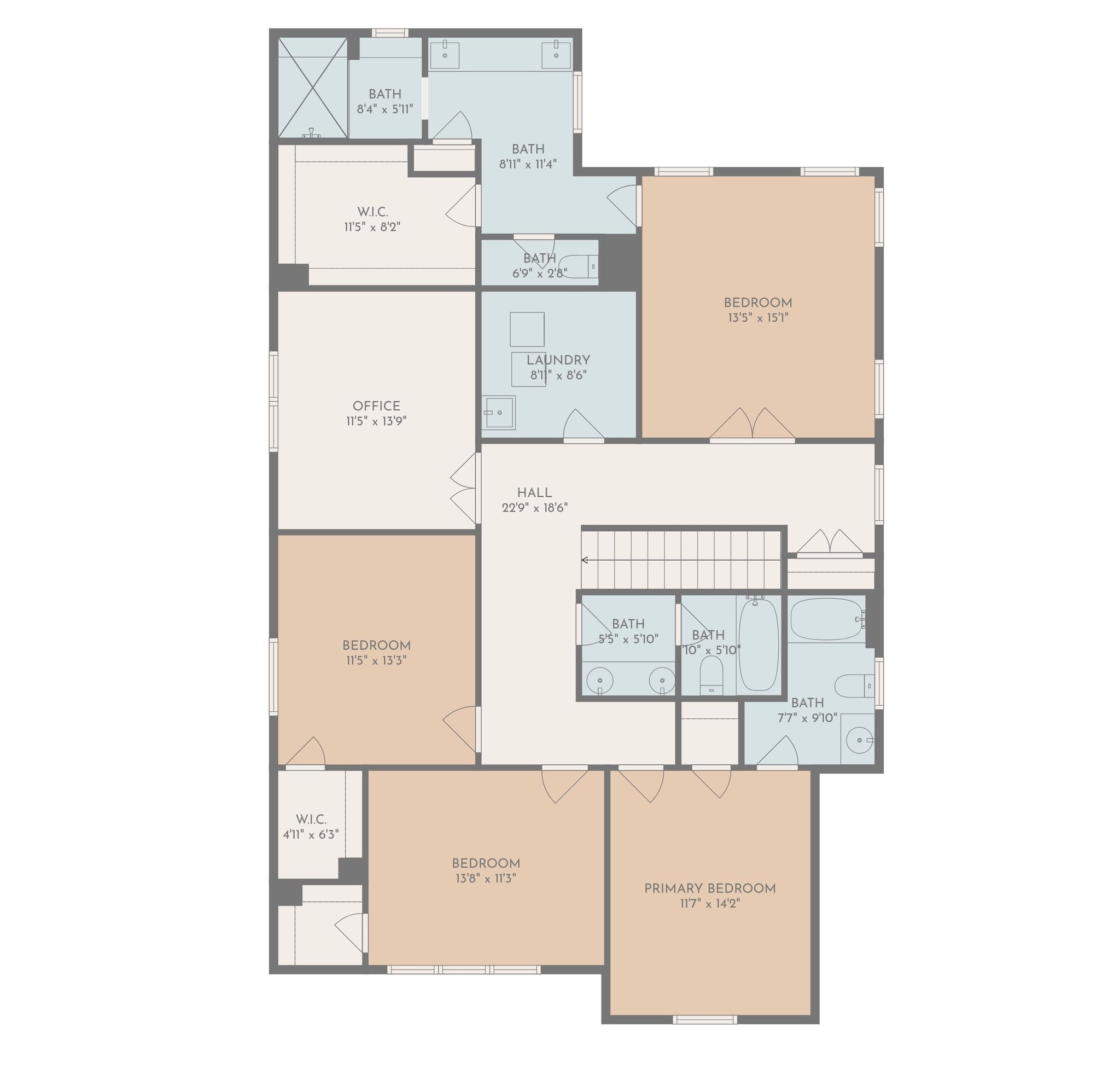 Upstairs, the luxurious owner’s suite boasts a tray ceiling, spa-like bath with a large walk-in shower, quartz counters, dual sinks, and an oversized walk-in closet. Two bedrooms share a hall bath with dual vanities and a private tub/shower area, while another bedroom enjoys its own en suite bath. A large office with double doors provides flexibility for remote work, media, or playroom needs. The upstairs laundry includes a sink.