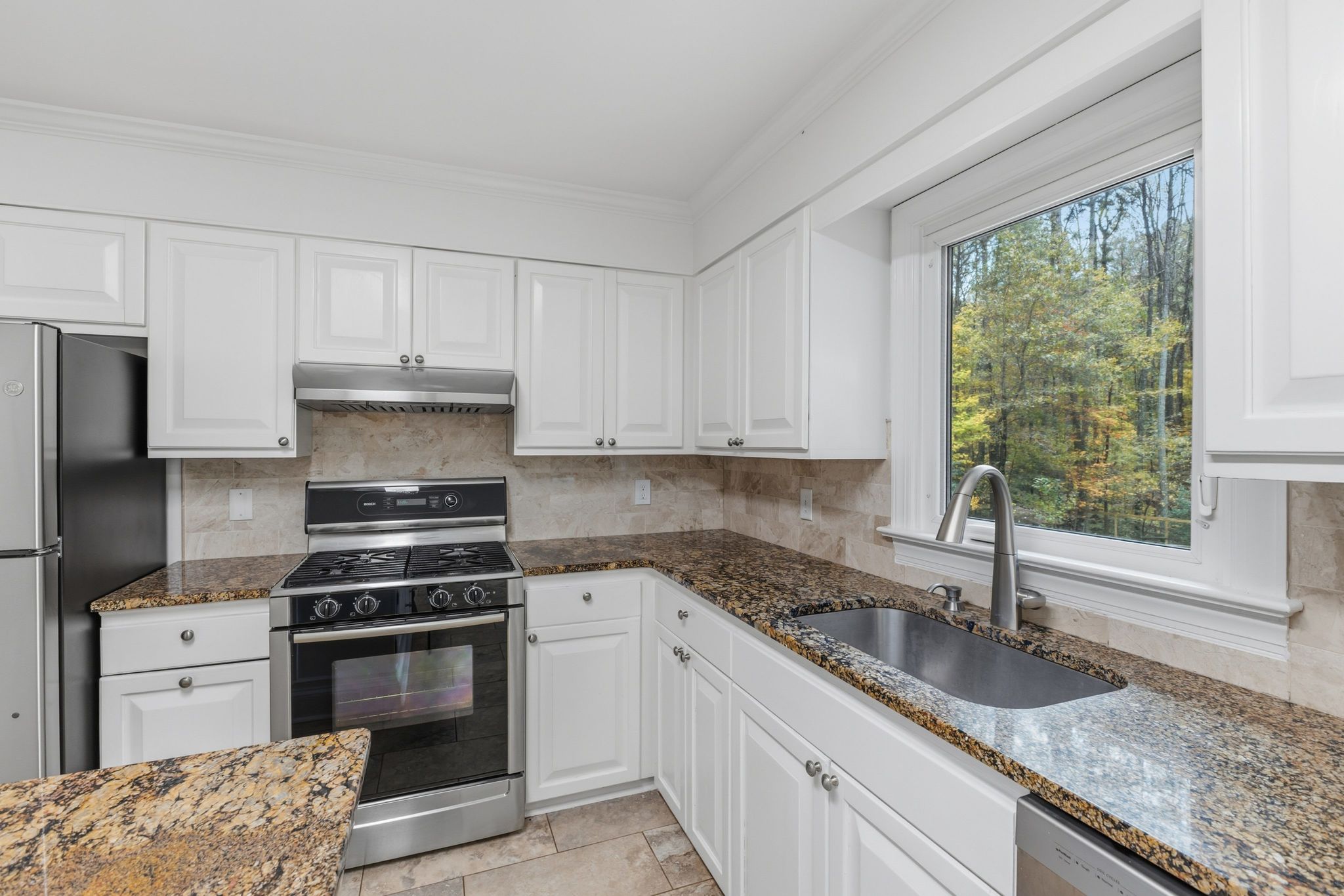 Inside, you’ll find a thoughtfully remodeled kitchen featuring granite countertops, stainless steel appliances, a gas range, center island, and tile flooring. Flowing hardwoods connect the living, dining, and bedroom spaces, complemented by smooth ceilings throughout.